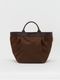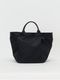 パンツのタックに着想を得た立体的なフォルムが特徴の新作バッグ。軽量で光沢のあるナイロンツイルに、厚手のナイロンテープとレザーハンドルを組み合わせることで、実用性と上質さを両立。丸みのある芯入りのハンドル。ボディと裏地の両面には弱撥水加工を施し、日常使いにも適した仕様。13インチのPCも収納できるMサイズは、日常の荷物をしっかり持ち運べる容量を備えています。